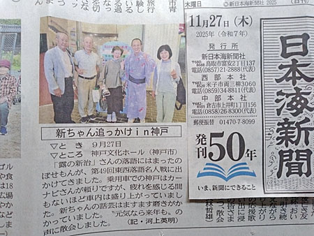 「日本海新聞に!」 9月、神戸の「東西落語名人選」には、各地からかつての「露の新治を育てる会」の方々が応援に来て下さいました。その中の、鳥取県江府町の方との記念写真が、地元の日本海新聞に載りました。嬉しいので、ホームページに掲載さして戴きます。遠路ありがとうございました。来年、もし出番を戴けたら、また走って来て下さいませ。 ![]() (提供:河上英明さん)