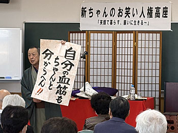 「新発田市隣保館にて。」 (2025.11.12) もお何度もおせわになってる、日本最北端の新発田市隣保館。たくさんお越し戴き、私ものびのびとはじけさせて戴きました。お笑い人権高座のあと、落語は夫婦二様(めおとさまざま)と題し、「ふろしき」と「きせる」を申し上げました。鳥取から東京、新潟と行く先々で、あたたかくお迎え戴き、噺家としてほんまにありがたいです。せめていっぱいお笑い戴こうと思てます。13日は、曹洞宗の皆さんにお世話になります。精一杯勤めさして戴きます。 ![]() (渋谷隣保館長撮影) 「曹洞宗新潟第四宗務所研修会。」 (2025.11.13) 新潟県新発田市、ホテル泉慶にて、曹洞宗新潟第四宗務所の研修会。私は人権の講座を担当。「新ちゃんのお笑い人権高座」、住職さんと檀家総代さんら、ほぼ男性の200人。よお聞いて、わろて戴きました。本講座は、野田大灯老師(香川県高松市、報四恩精舎前住職、元本山総持寺後堂)。野田老師は1984年、不登校や非行の青少年を受け入れる喝破(かっぱ)道場を設立、更生保護活動をされてました。私はその頃、同じ香川の西日本放送でテレビのレポーターや、ラジオのパーソナリティをしていて、何度か取材をさして戴きました。その頃は、自分が後年人権の話をするようになるとは夢にも思いませんでした。それが40年後、こんな形で再会するとは!ご縁とは不思議なものです。79歳にして元気に活躍される野田老師。思えば、当時私が34で、ご老師は39歳(若かったなあ)。私はアホなことばっかりやってましたが、ご老師はすでに立派な和尚様の風格でした。懐かしく昔話に花が咲きました。