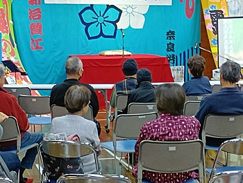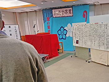 休憩後は落語「ふろしき」で大爆笑。 ![]() ![]() 12日(日)、「集い処ATIUS」「初寄席」が開かれ、露の新治が出演しました。この集い処は、吹田のSさんが自宅の一部を改造し、ミニコンサート等を開催出来る防音付のスペースを誂えたのです。これまでライブは開催してきたそうですが、家主のSさんに拠れば「寄席の初回は露の新治にしたかった」との事でした。 当日は会場満杯の20数名が座り、14:00の開演を待ちました。新治さんの話は立ったままのお馴染み「お笑い人権噺」→休憩→「夜間中学との出会い・その取組み+狭山事件とは・その取組み」で実に16:30まで! もう一度休憩を挟み、着替えてから高座に座し、小噺は難しいとの枕から、『風呂敷』を噺しました。満場の人が「笑い→真剣→笑い」を堪能する時間を共有出来たと思います。その後、ほとんどの人が交流会に残り、新治さんを囲んで色々な話題で盛り上がりました。