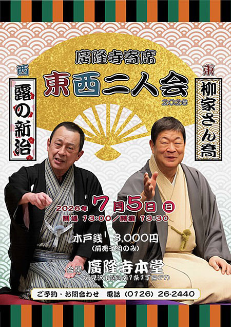 昨年四月「特濃6」で初めて露の新治師匠の「中村仲蔵」を拝聴し、とても魅了されました。女性の仕草がなんとも歌舞伎的で上品でした。大阪以外のお仕事が多く、なかなか拝聴出来ませんが、今年は大阪でのお仕事を増やしていただけるようで楽しみにしております。【2026.1.5 KM様】(「露の新治メールNEWS」の配信希望ということで、メールをいただきました。落語会情報をお知らせしていきますので、お楽しみに。MORI)