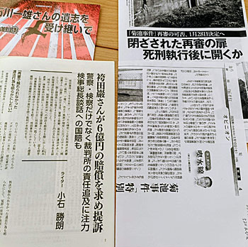 いつもの最終日曜、いつもの時間帯はいつもの常連参加者のみ。今回は、狭山以外の資料を読み合わせた。28日(水)に決定の出る菊池事件再審について『毎日新聞』と『週刊金曜日』の記事を先ずは読み合わせた。4人の内3人は「国民的再審請求」の呼びかけに応えており、じっくりと読んだ。狭山パンフは559号の袴田さん国賠訴訟と559・560号の大川原化工機冤罪事件の損賠訴訟についてを連続して読んだ。全員の感想として「裁判所の犯罪が全く裁かれず、謝罪もしようとしない」事への怒りが込み上げた。 ![]() このページのトップへもどる・・・ トップページへもどる・・・ |