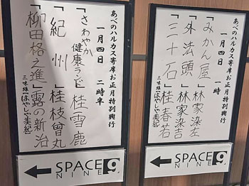 「あけましておめでとうございます。」 (2026.1.1) 新年あけましておめでとうございます。去年はお世話になりまして誠にありがとうございます。今年はいよいよ「後期高齢者」。幸い体もなんとか動き、まだ高座に上がれます。お客様と高座で向き合うことが何より嬉しく、そしてありがたいです。おかげさまで「東西名人選」「よこはま落語会」と大きな会、さらには「鈴本演芸場お盆興業」にも用いて戴きました。独演会も去年は熊本、東京で、今年は名古屋、東京、岐阜でさせて戴きます。以前の私には考えられないことです。噺家晩年、幸せで、ほんまにありがたい限りです。今年は、ハルカス寄席を芯に、大阪での高座を充実させていくつもりです。大変な時代になりつつありますが、何があっても元気に笑顔で生き抜く所存です。皆様もお元気で、そして笑顔でお過ごしくださいませ。何卒よろしくお願い致します。 露の新治 拝 「ハルカス寄席初席。」 (2026.1.4) 1月4日(日)、ハルカス(笑かす)寄席。今日もたくさんお越し戴きまして、ありがとうございます。