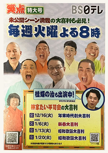 べっぴん寄席にお越し戴きました、尾道のYKさん。遠路ありがとうございます。「21日の喜楽館、仲蔵にも行きますよ」と嬉しいお言葉。また、こんばらさん師のファンが、益田市から走って来られました。地元の方も多数お越し戴き、盛り上がりました。往復13時間のドライブも楽しく、ほんまにありがたいべっぴん寄席。来年は20年目! 願生! 「蝶の治さん、BS笑点に!」 (2025.12.8) 桂蝶の治さんがBS笑点に出演! ![]() 「露の団姫 改め 五九洛さんより。」 (2025.12.10) お坊さんが「法話のネタにさせて貰ってます」とゆうてはりました。 おはようございます